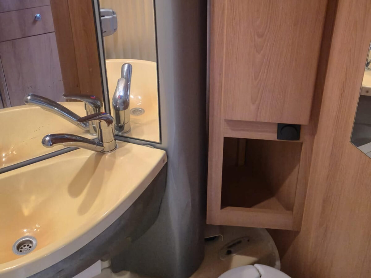 Il bagno è dotato di tutto il necessario: WC, lavandino, doccia integrata e armadietti per gli oggetti personali. Perfettamente integrato nella zona living, ti garantisce autonomia totale durante ogni viaggio, senza rinunciare alla comodità.